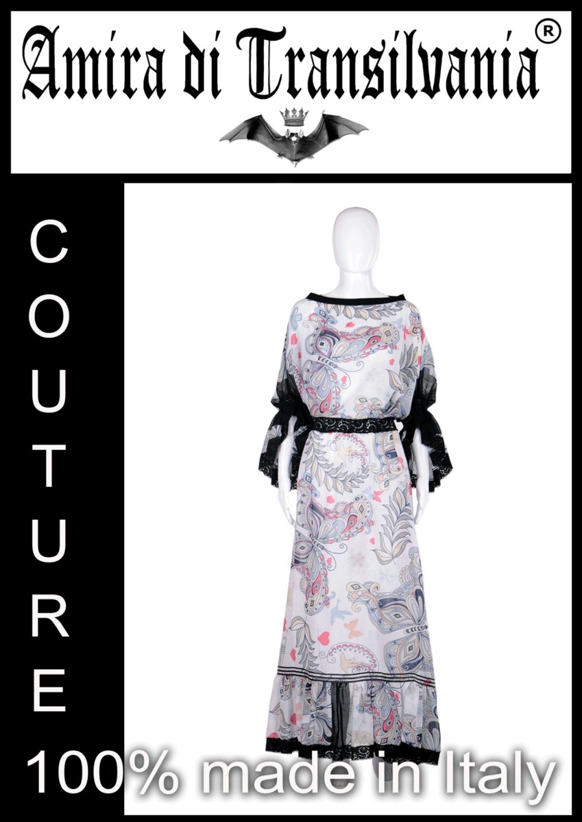Morbido couture in misto seta e cotone con fantasia arabesque e bordi in pizzo. 100% made in Italy . Qualità sartoriale.