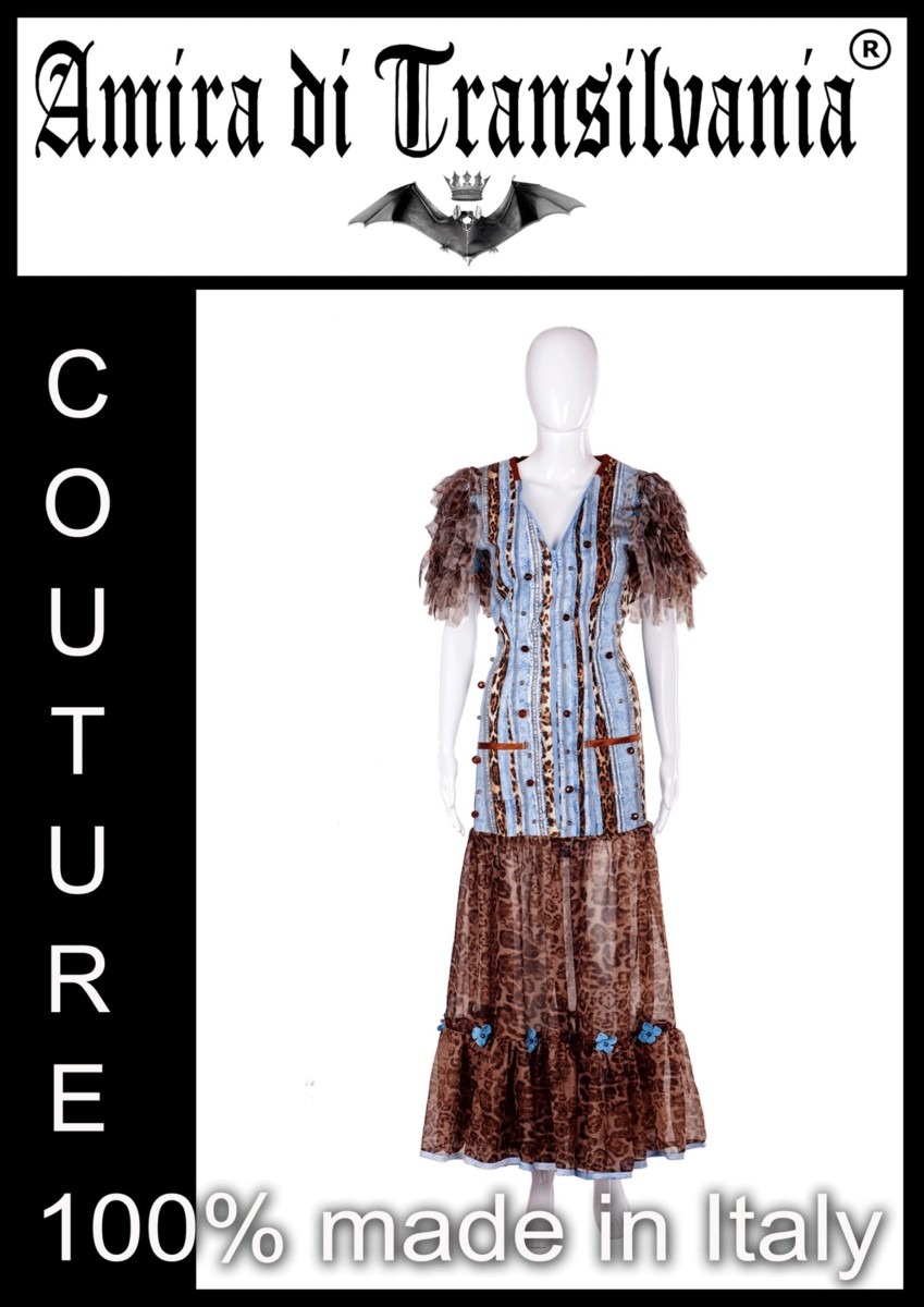 Stravagante Abito couture in jeans e organza fantasia leopard. 100% made in Italy. Qualità sartoriale.