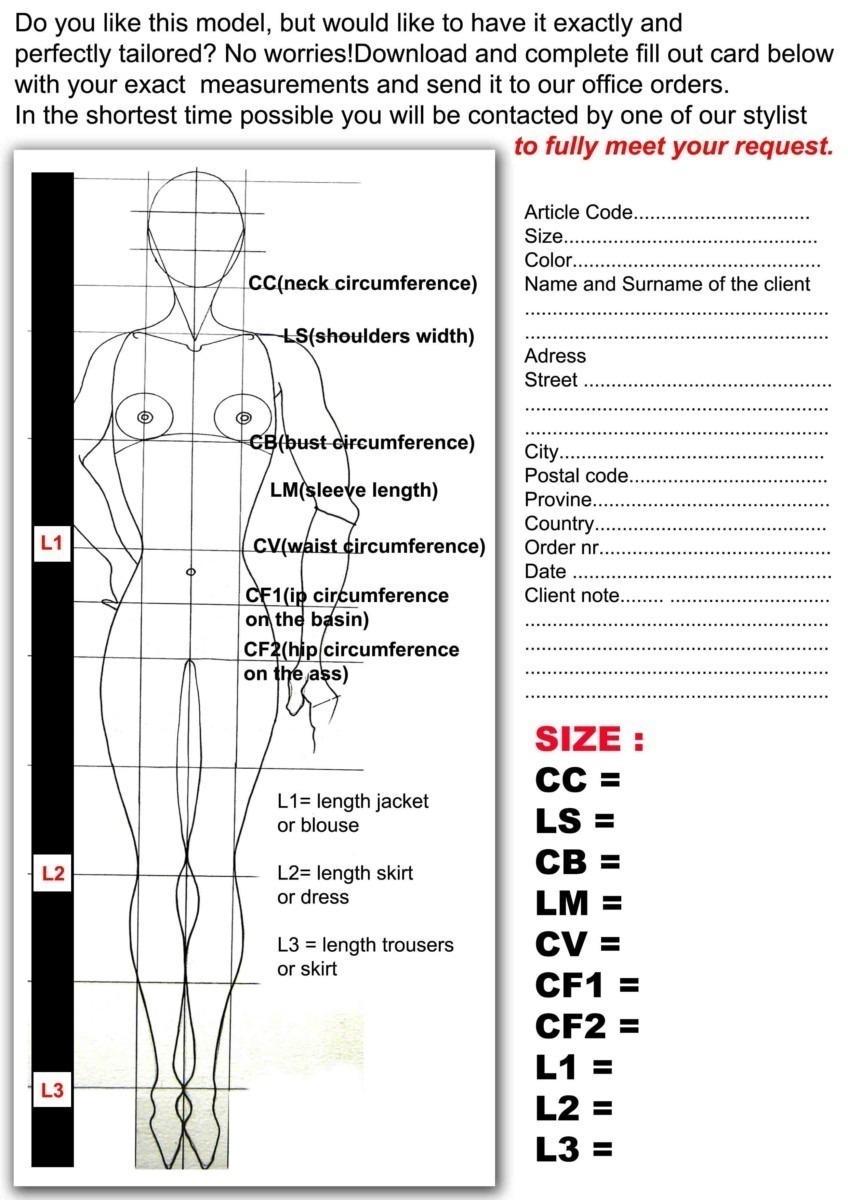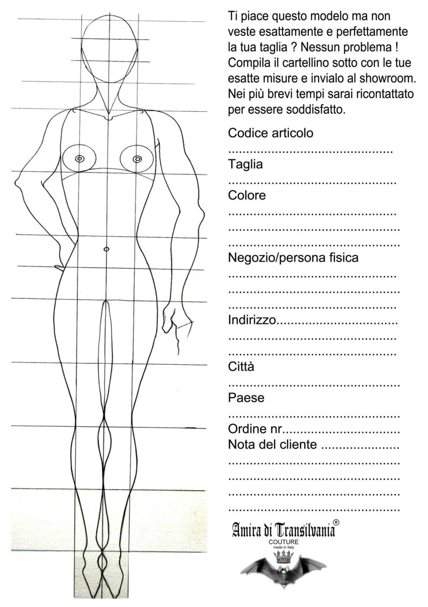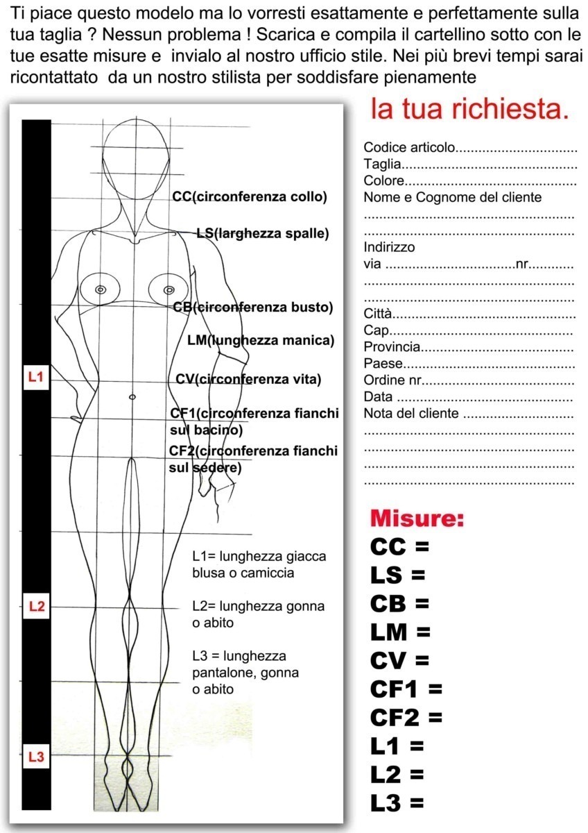 Per ordinare un capo su misura scaricate il cartellino con le misure , vi misurate, lo compilate e ce lo inviate via mail al indirizzo di contatto PRIMA DI PROCEDERE AL VOSTRO ORDINE.