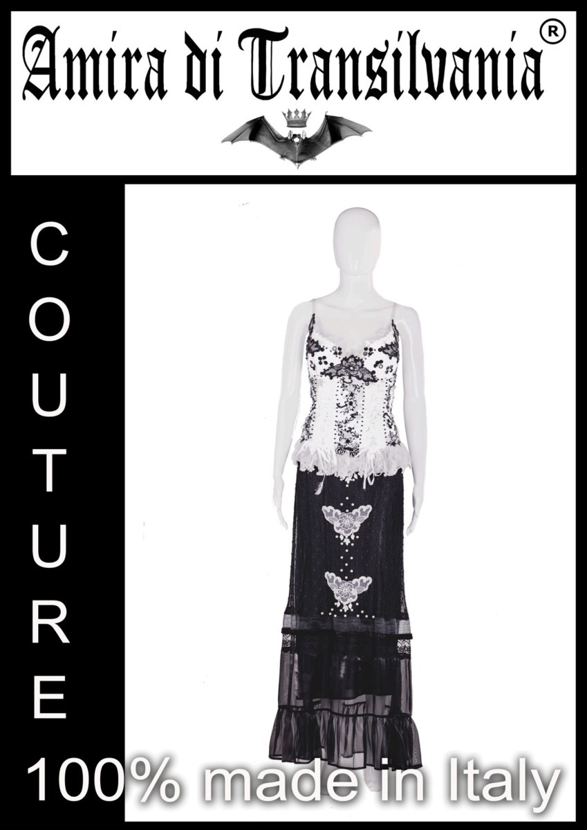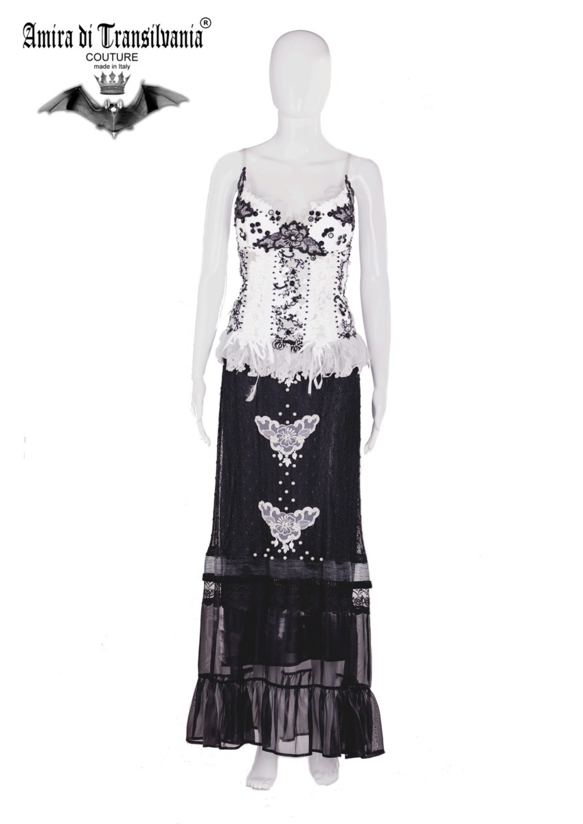 Completo nero e bianco con corset e gonna in pizzo e ricamo realizzato esclusivamente a mano in Italia.