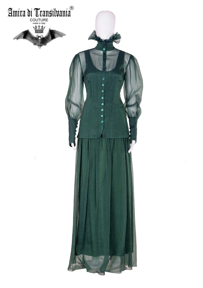 Composto da gonna foderata in tinta e camicia con collo alto. Chiusura con bottoni in madre perla